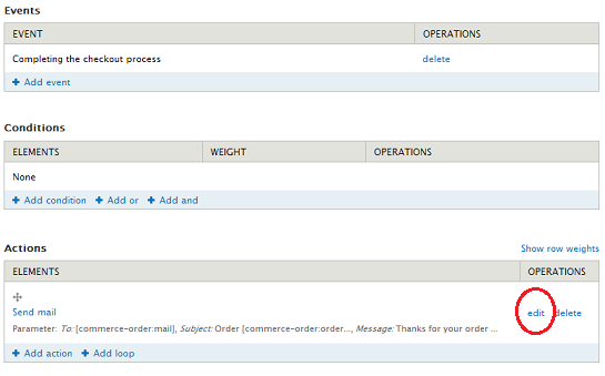 Para adjuntar esta tabla contamos con un token que debe ir en el correo electrónico. Para hacer eso debemos tener habilitado el módulo Rules UI y luego ingresar a la página de configuración (admin/config/workflow/rules) y buscar la regla "Send an order notification e-mail", le hacemos clic en editar y veremos algo como esto: