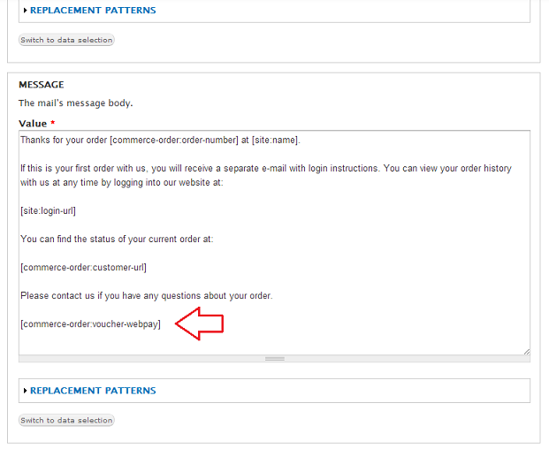 Aquí es donde podemos editar el contenido del correo electrónico, le damos clic en editar (la imagen te indica donde) y buscamos la sección "Message", aquí es donde agregamos el token [commerce-order:voucher-webpay], un ejemplo:
