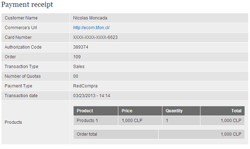 Nota: Este comprobante, que es el mismo que se ve en la página de éxito, tiene adjuntado una vista generado por el módulo Views, esta vista sufre sutiles cambios por Drupal Commerce que es alterar el acceso, todo bien salvo que el correo electrónico se envía cuando se hacen las validaciones en la página de cierre que utiliza Webpay y esto lo realiza el KCC como un usuario anónimo, esto hace que el comprobante tenga todos los datos salvo la vista de los productos, esta quedará vacío. Una solución a esto es editar dicha vista, llamada "Shopping cart summary", en ella se debe seleccionar la opción "Disable SQL rewriting", que está en las opciones de la Query de la vista. (Esta vista es usada en el checkout del usuario y no cuenta con un display como página, no debería haber problemas de seguridad al habilitar esta opción)