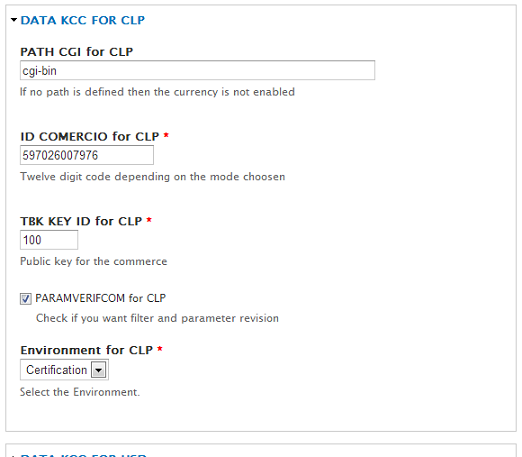 Como se ve en la imagen, existen secciones para la moneda chilena y para la del dolar ¿Por qué? Webpay permite que un sitio pueda operar con moneda nacional o con dolares, sin embargo no pueden operar al mismo tiempo en una misma configuración, ya que ambos usan distintos códigos, en otras palabras, si necesitan operar con las dos opciones, tendrán que tener instalado dos KCC en sus servidores, exactamente iguales, el único archivo que cambiará será el tbk_config.dat y se generarán otros archivos en la carpeta logs. Especificamente podríamos tener adentro de la carpeta cgi-bin, dos sub carpetas, una que se llame clp y otra usd, y en cada una de ellas un KCC completo. En esta oportunidad solo vamos a trabajar con CLP, así que configuraremos dicha sección solamente.