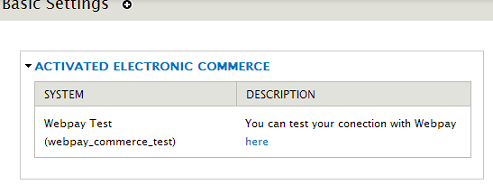 Para probar la conexión podemos instalar el módulo Webpay Test, el cual viene incluido en Webpay API, simplemente se habilita. Pueden comprobar en /admin/config/webpay/configure-basic si el sistema de Prueba esta habilitado para operar con Webpay, debería aparecer esto: