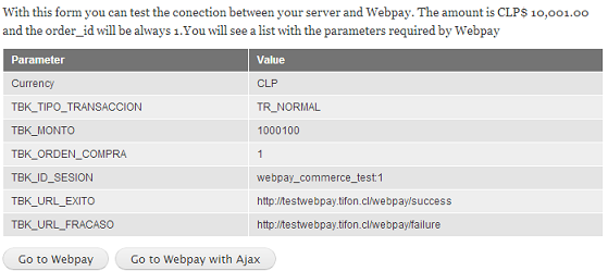 (Aquí mismo deberán estar Ubercart o Drupal Commerce cuando se integren con Webpay API.) Desde aquí menciona a que link se debe ir para probar la conexión, entrando a http://misitio.com/webpay-test. Entramos a la opción de probarlo en CLP y nos mostrará los datos que se enviará a Webpay: