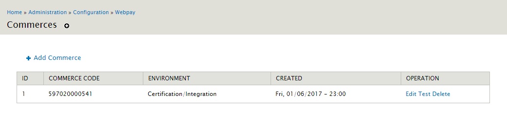 En esta sección entramos a Commerces. Aquí se ingresan los códigos de comercio que te asignaría Transbank junto con las llaves publicas y privadas. Al instalar el módulo, automáticamente ingresa un comercio de prueba para certificar la integración.